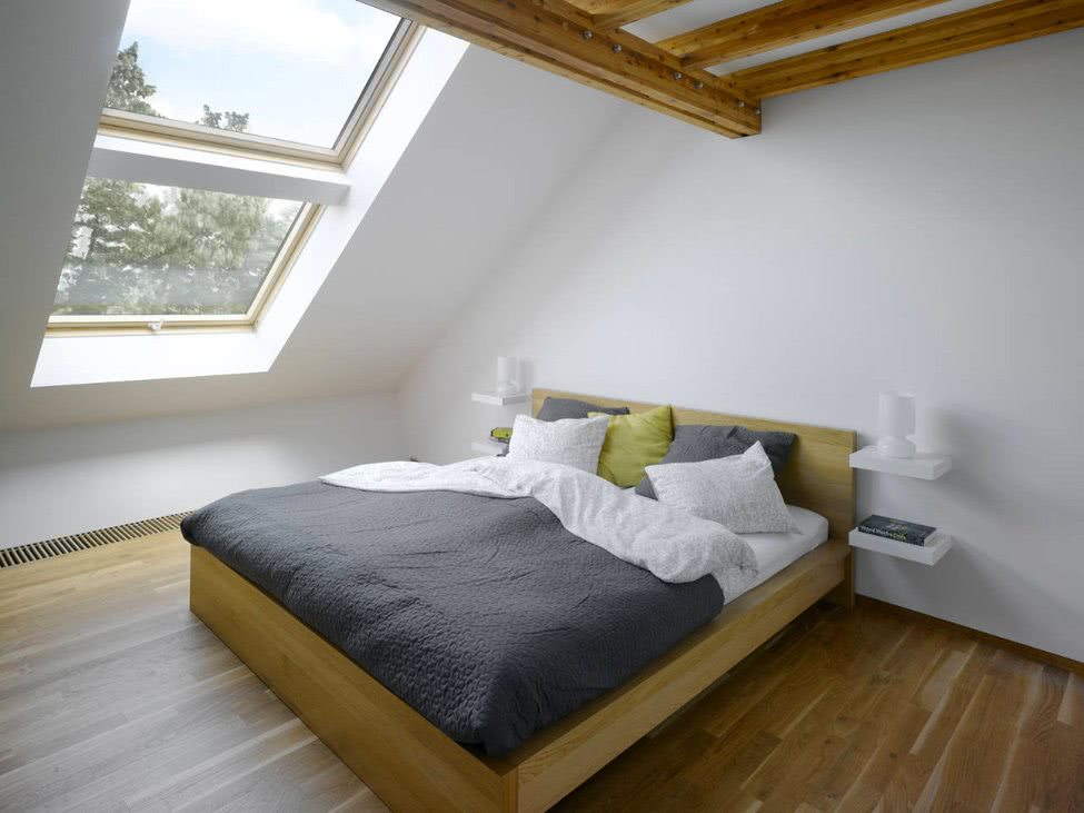 Расположение спальни может быть вдохновлено природой. Верхний этаж здания дает много интересных вариантов. Пересматривая натуралистический дизайн интерьера, вы можете увидеть использование натуральных чердачных откосов. Отдельные элементы крыши не должны быть скрыты вообще. Балки также могут быть покрыты защитным составом и обнажены. Благодаря этому мансардная спальня приобретет довольно оригинальный характер в стиле Wellness.