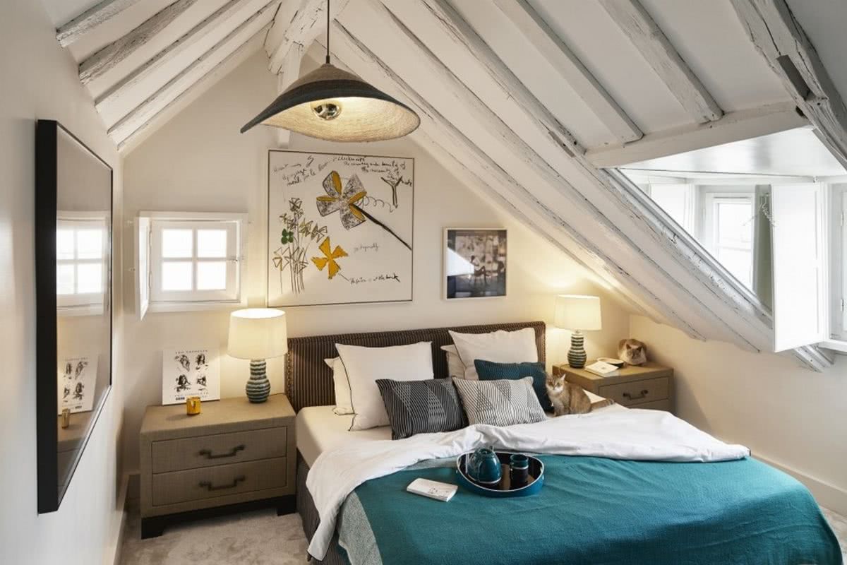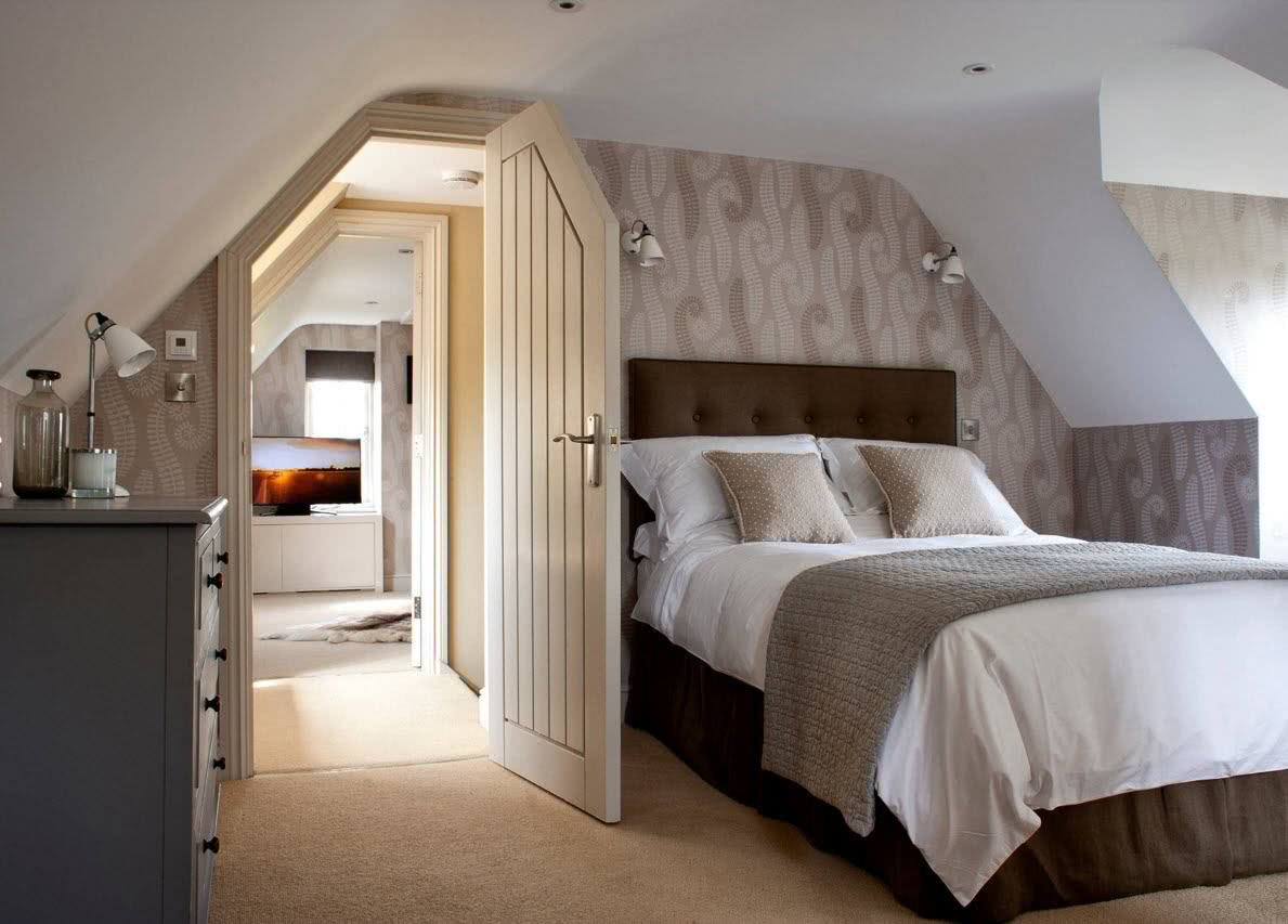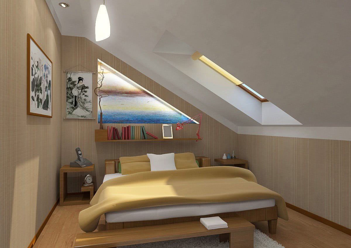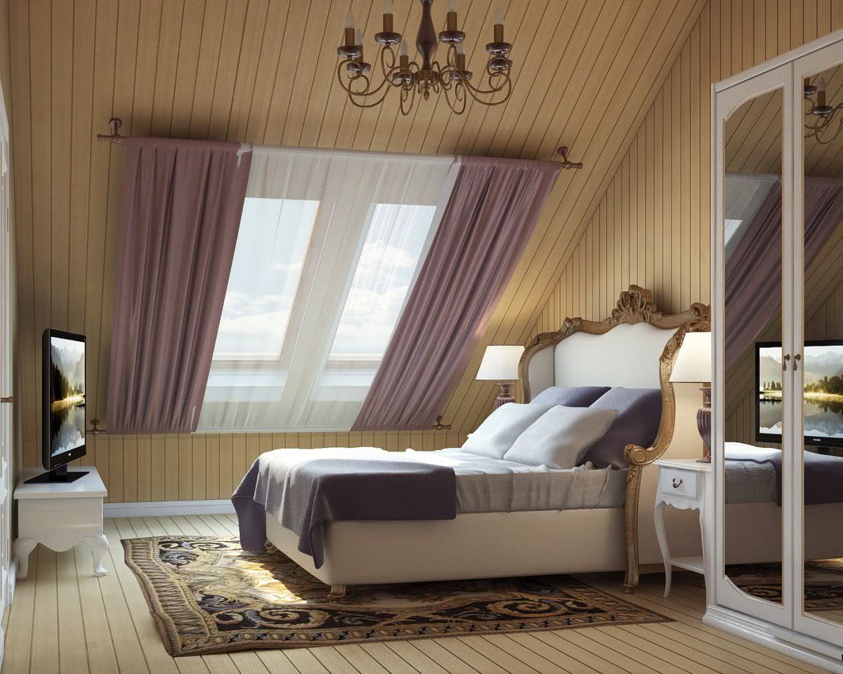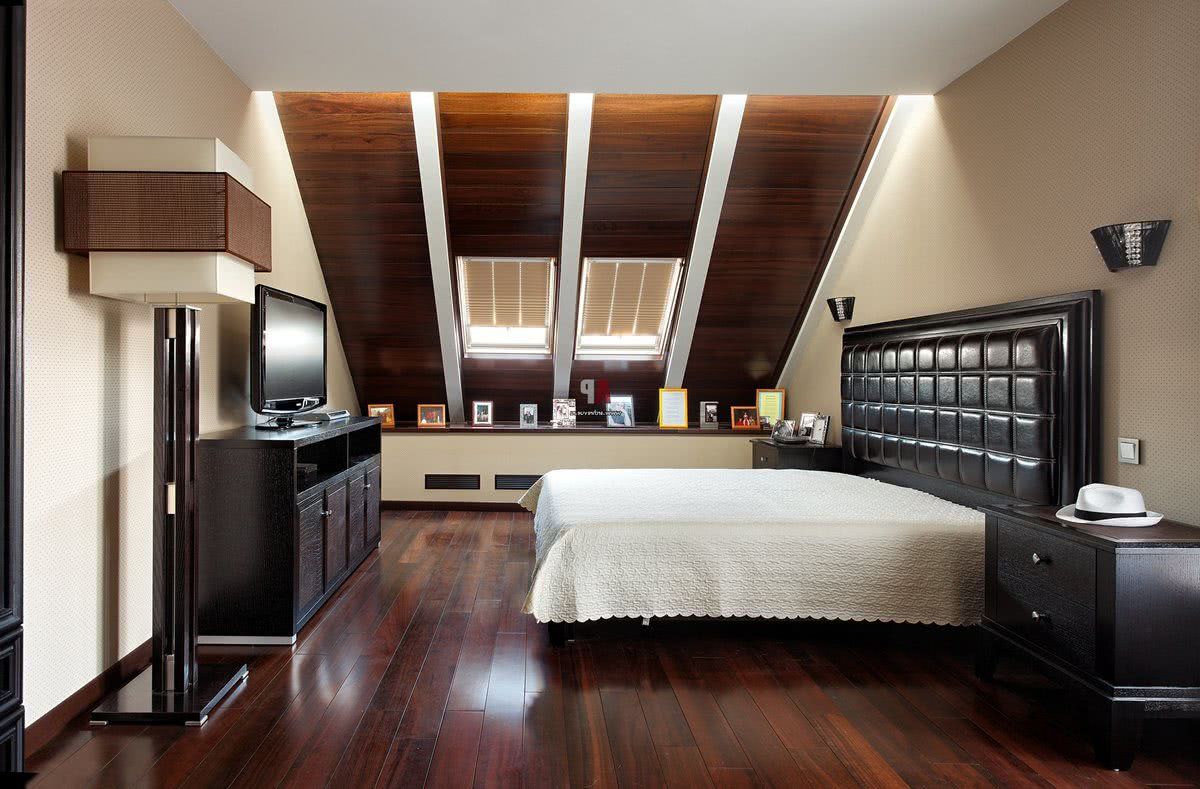 Планировку спальни следует осуществлять, учитывая тип кровли. Форма крыши является решающей при расположении мебели. Очень редко мансарда имеет прямой и ровный потолок. В некоторых домах потолка на крыше и вовсе нет.