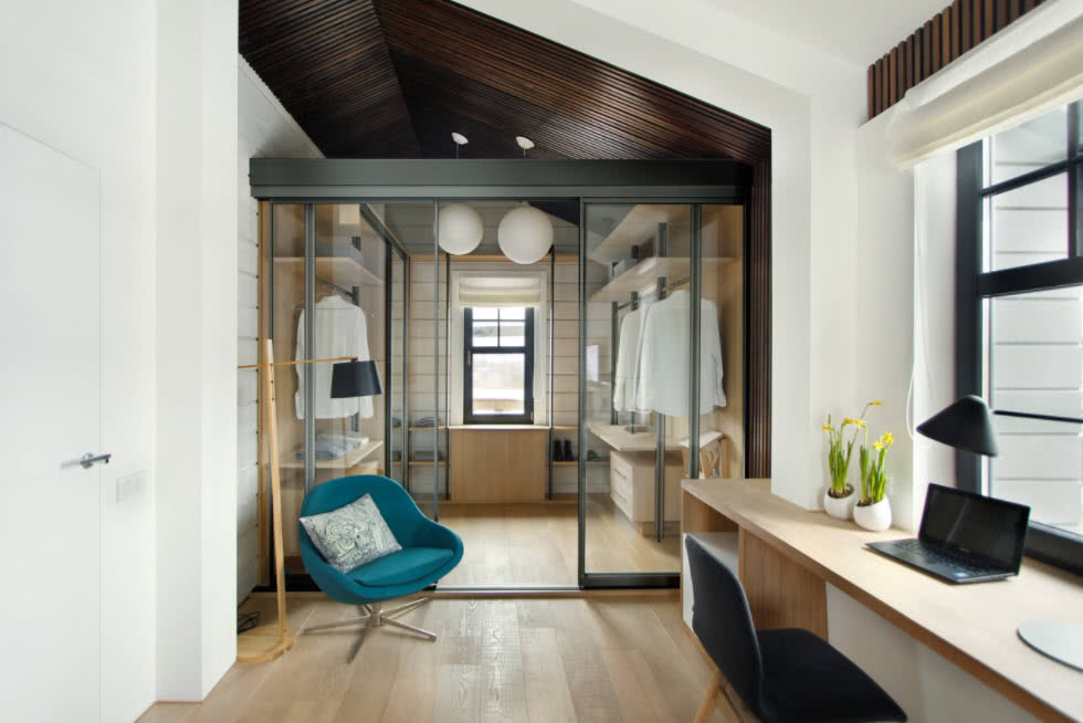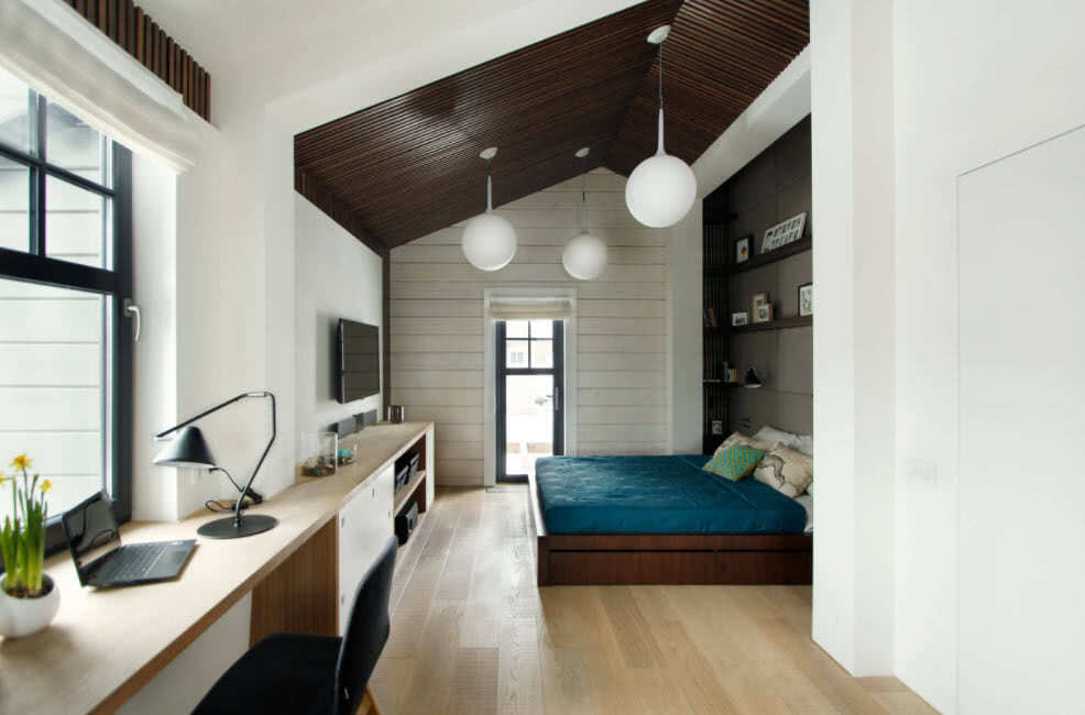 Под двухскатной кровлей, где внешне недостаточно места, размещают спальни. Часто кровати устанавливаются в ниши под скошенные стены. Можно сделать мастерскую, гардеробную или кабинет на мансарде.
