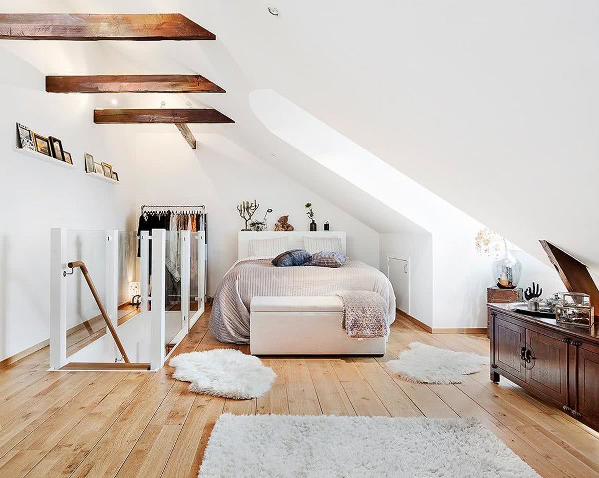 Спальное место может находиться около прямой стены. Её можно окружить стеллажами с закрытыми или открытыми полочками. Под гардеробную можно отвести небольшую часть чердака. Такое решение часто выбирают в том случае, если на чердаке есть балкончик и следует оставить выход на него свободным.