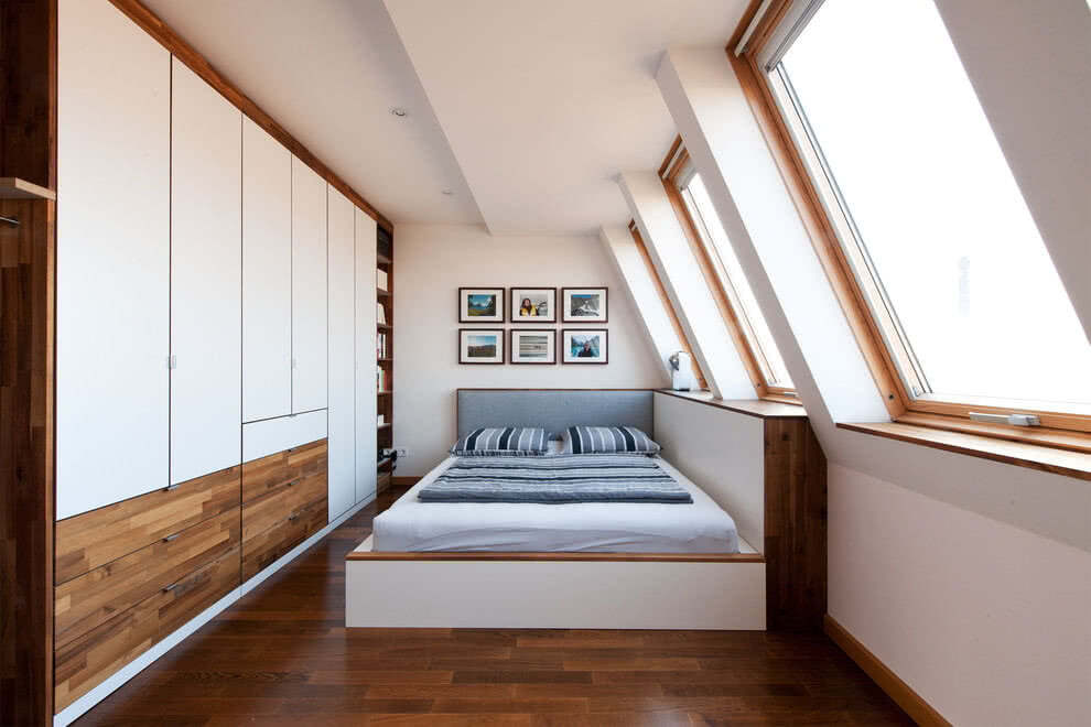 Мансарда с двускатной крышей может применяться для оформления спальни, но её форма не позволяет поставить большой, просторный шкаф под одежду. Можно создать системы хранения вдоль стен, но этот вариант только подойдёт для просторных помещений.