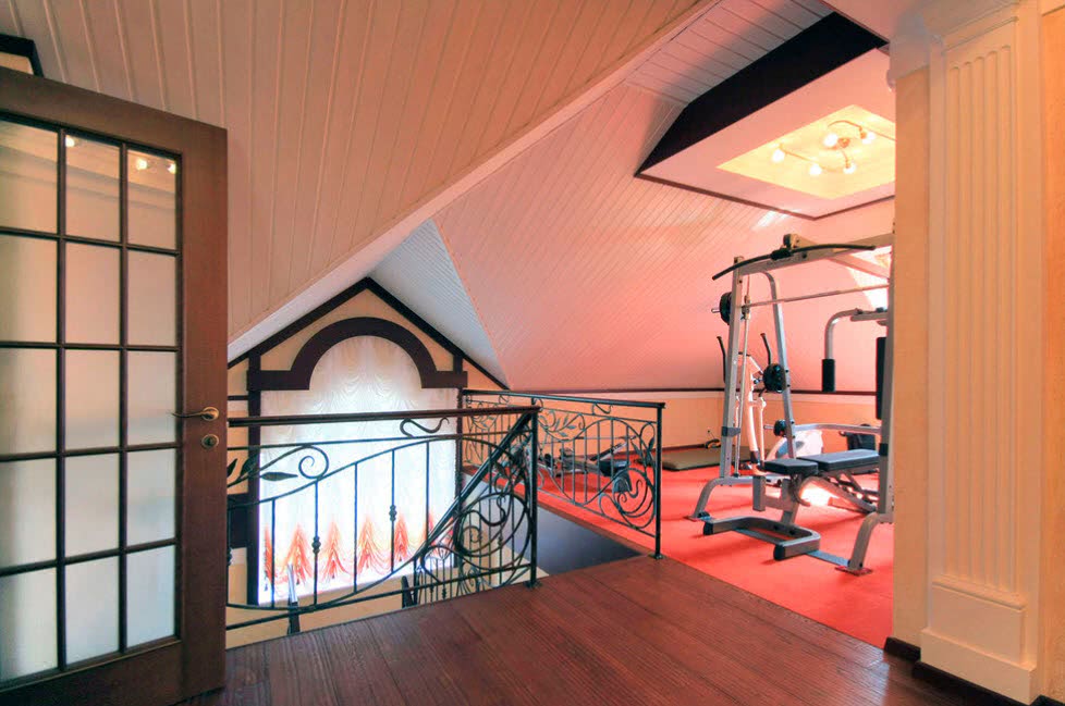 Мансарда может превратиться в домашний тренажерный зал. Выделить отдельное помещение для занятий фитнесом в доме сложно. Чердачное помещение может предоставить замечательные условия для тренировок. Можно заниматься йогой, аэробикой, танцами, поставить стол для пинг-понга, установить тренажеры.