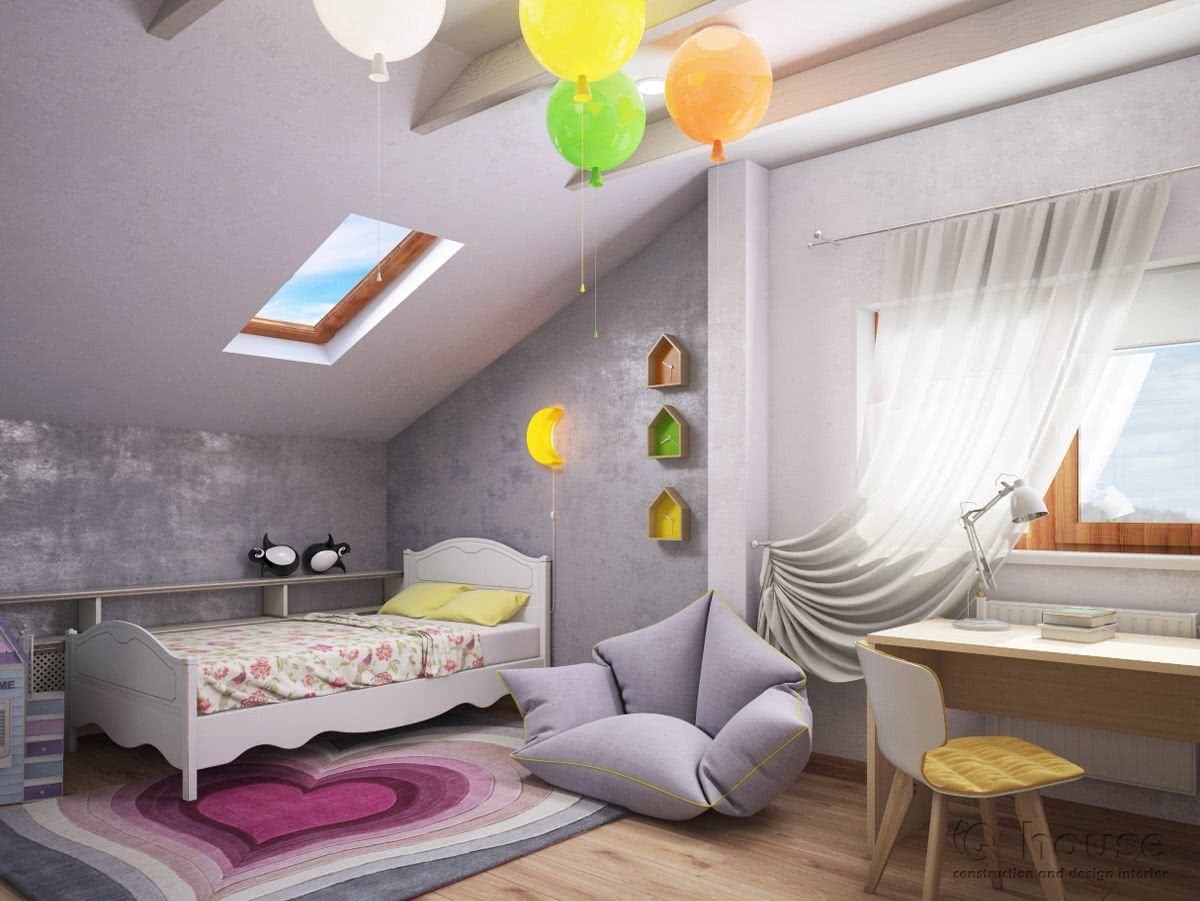 Когда на мансарде много окон, возникает эффект перенасыщенности света. Взрослые его переносят хорошо, на детей он сильно давит, поэтому желательно все уравновешивать и добавлять в пространство немного темных красок. Они лучше всего будут смотреться в зоне для занятий. А игровая часть пусть остается солнечной и светлой.
