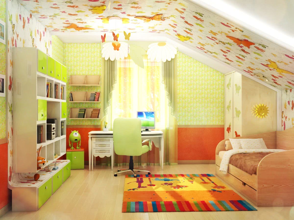 Использовать цвета, способные спровоцировать агрессивное поведение, не стоит. Психологи советуют отказываться от всех оттенков красного, насыщенного розового, фиолетового. Классическое сочетание черного и белого тоже плохо подходит: получится очень перегруженной детская комната – дизайн помещения со скатами сам по себе очень сложный, а тут еще такие резкие перепады цветов. Нужно стараться избегать подобных решений. Девочки уютно чувствуют себя в комнатах кремовых жемчужных цветов. Мальчикам больше нравятся голубые краски.