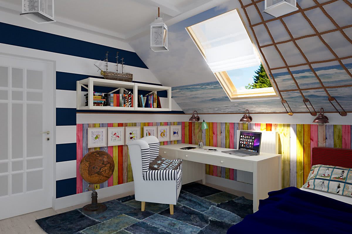 В увлекательные путешествия можно пускаться, если комната, оформлена в сочетании цветов моря и теплого песка, если мебель подобрана таким образом, чтобы внутреннее пространство напоминало палубу большого корабля. Балки на потолке вместо мачты, сети и цепи в качестве украшений – атрибутика может быть разной. При помощи нее нетрудно создавать нужную атмосферу. Оформленная таким способом детская на мансарде в деревянном доме, будет смотреться очень органично. Она идеально подойдет мальчику, страстно увлеченному подобной темой.
