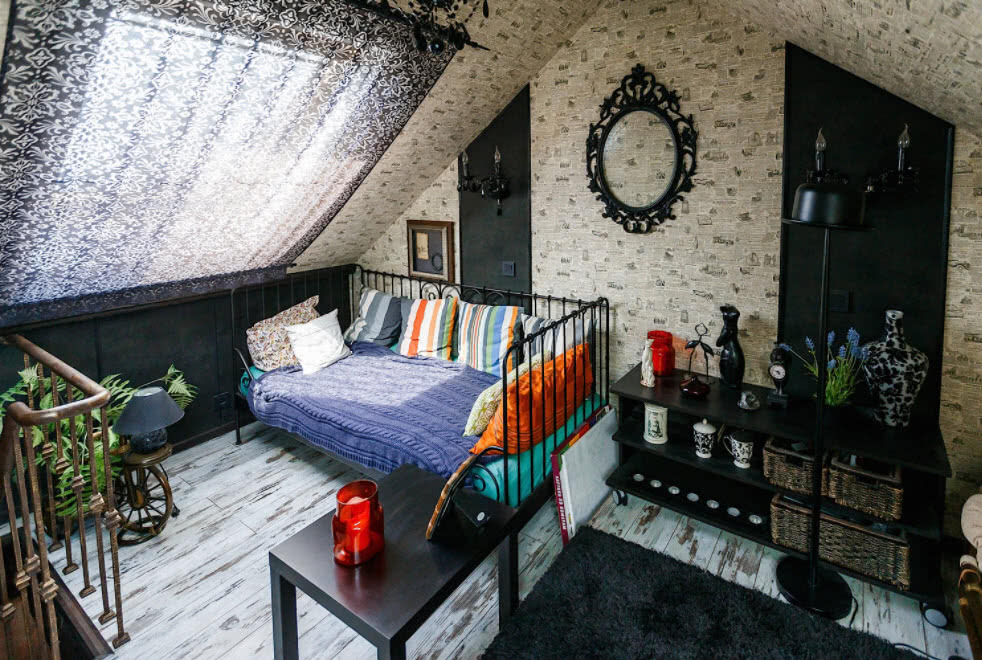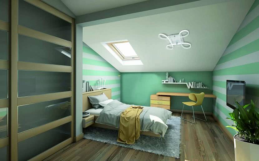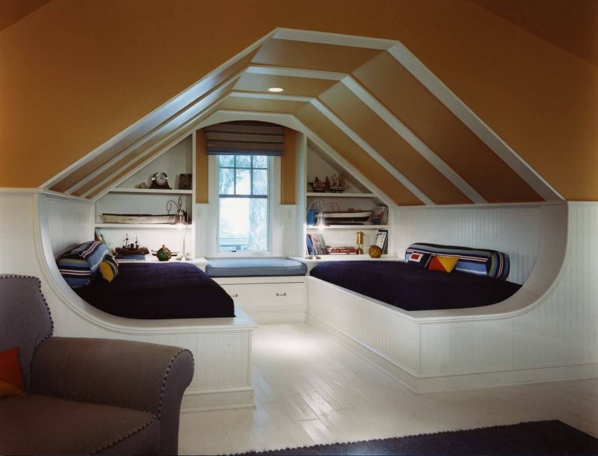 - удачно обыграть наклонные стены, системы балок, стропил;