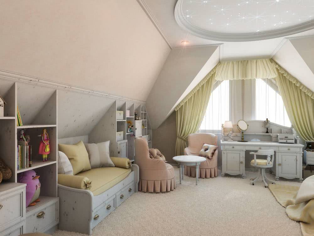 Только когда черновая работа вся будет выполнена, можно приступать к формированию проекта оформления чердачного помещения. Обычно дизайн детской комнаты мансардного типа начинается с зонирования помещения