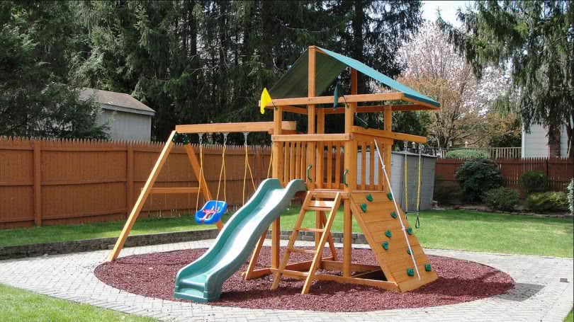 Также встречаются зоны отдыха под деревьями или закрытые площадки, которые представляют собой отдельные «уличные» комнаты с крепкой крышей и летними стенами. Если в семье есть дети, то поблизости от места для проведения досуга для взрослых обязательно обустраивают детскую площадку с горкой и песочницей.