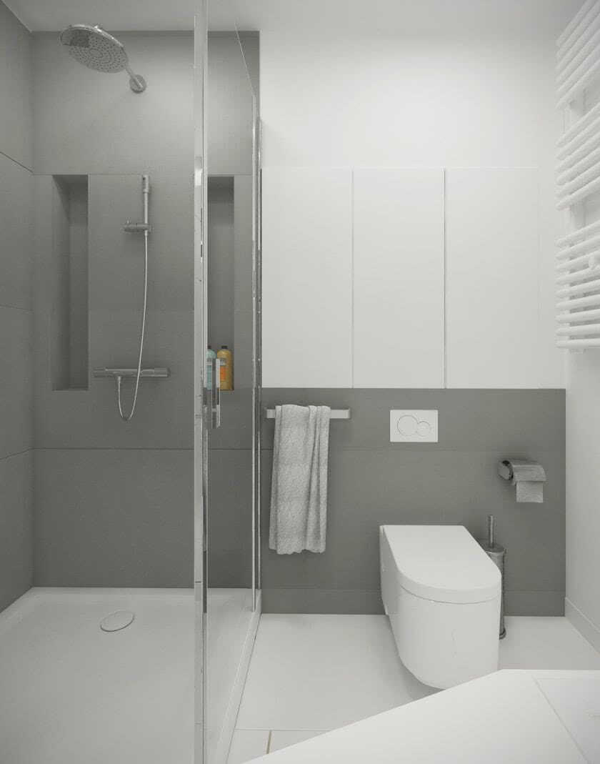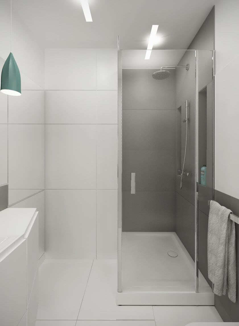 Современный интерьер ванной четыре кв. метра с разделением пространства на зоны: