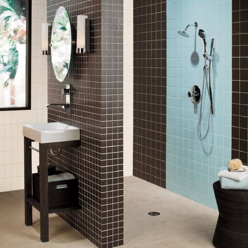 Вариант 10. Достаточное освещение позволяет использовать не только светлые оттенки в отделке. Крупная коричневая плитка в сочетании с мелкой бирюзовой мозаикой смотрятся очень интересно. Душевой трап сохраняет свободное пространство, а зеркало еще больше его увеличивает. Светлая сантехника в таком интерьере почти незаметна.