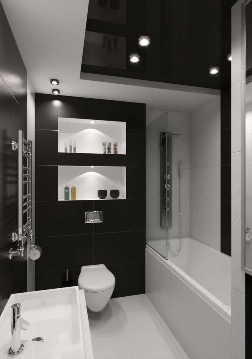 - зона унитаза отделана черной глянцевой плиткой, имитирующей натуральный камень, потолок над ванной окрашен черной водостойкой краской;