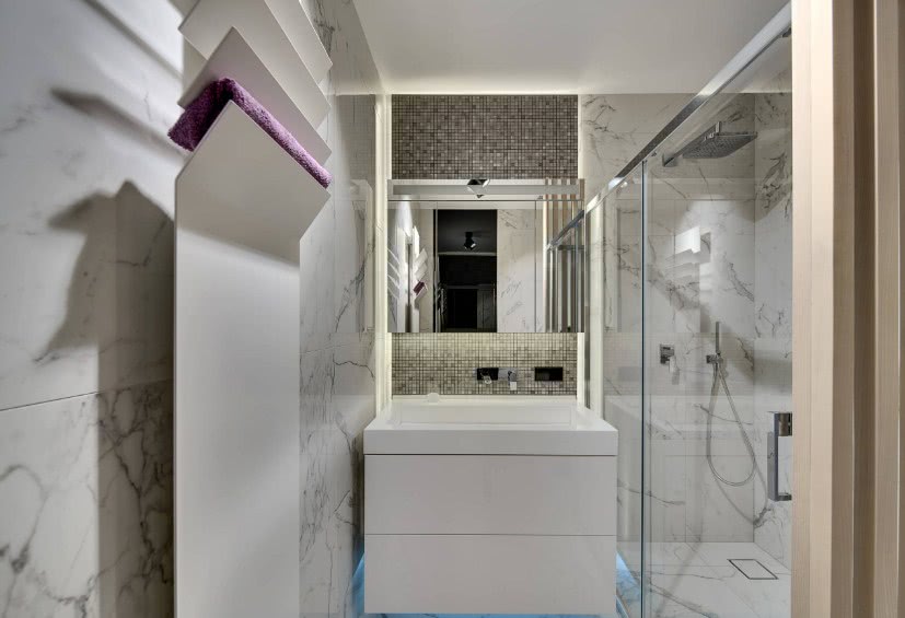 - Бойлер внушительных габаритов заменяют маленьким плоским модулем. Его монтируют над умывальником.
