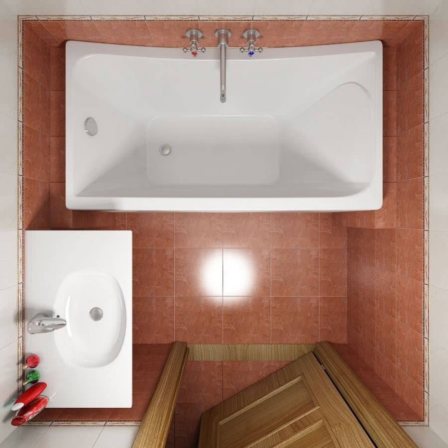 В случае нахождения двери в длинной стене ванну можно выбрать угловую либо так же разместить ее вдоль узкой стены.