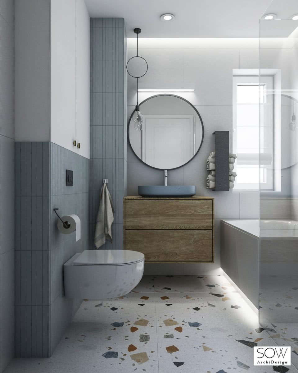 Стоит обратить внимание на то, как красиво раскрашенный Тераццо сочетается с пастелью. Интересным решением также является светодиодная подсветка под ванной, которая не только является дизайнерской изюминкой, но и позволяет создать особую атмосферу. Деревянная тумба под умывальник с голубой раковиной привносит в интерьер свое очарование. Обустраивая ванную комнату, стоит знать, что в настоящее время в моде умывальники отличного от стандартного белого цвета.