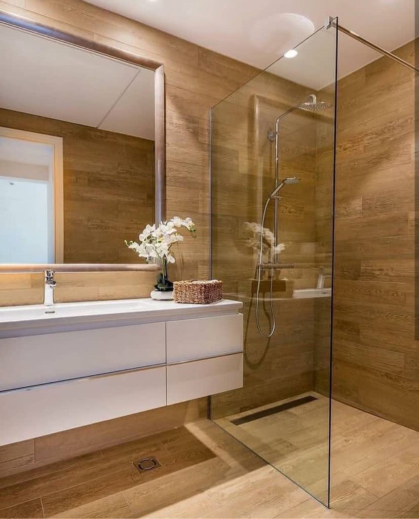 В целом, небольшие ванные комнаты с крупногабаритной плиткой выглядят просторнее. В этом случае вы даже можете использовать более темные цветы. Ощущение пространства становится еще более равномерным и открытым, когда стены и полы выполнены с использованием одних и тех же материалов, цветов.