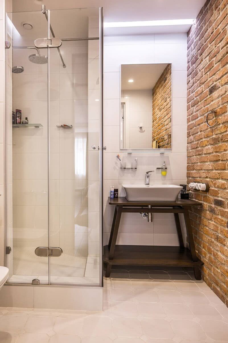Индустриальные мотивы естественно вписываются в дизайн ванной. На стенах создают имитацию кладки. Роскошно смотрится плитка или панели под кирпич. Если помещение маленькое, то вместо стандартной красной облицовки применяют белый глянец. Отражающий слой создаст визуальный эффект увеличенной площади.