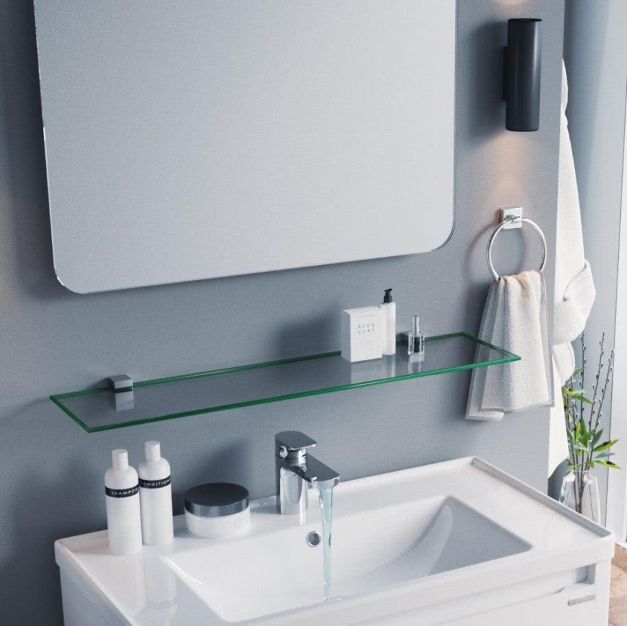- со стеклянной ванной и прозрачными полочками из полимеров будет ощущение «отсутствия» с визуальным расширением свободного пространства;