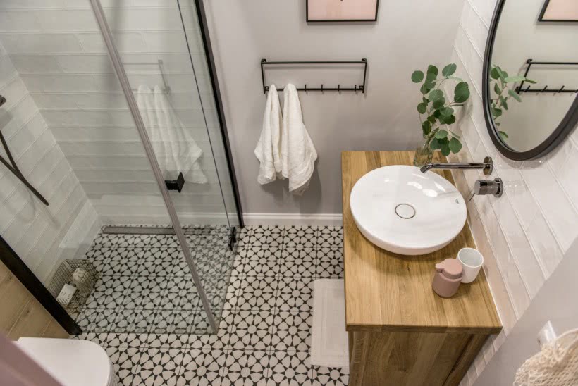 В монохромной ванной комнате пол можно оформить лоскутной плиткой «пэчворк», которая привлечет к себе внимание, становясь главным декоративным элементом. Воспользуйся виниловыми наклейками с тематическими изображениями. Их преимущество в том, что в любой момент ты сможешь сменить наскучивший дизайн без трудоемкого процесса демонтажа