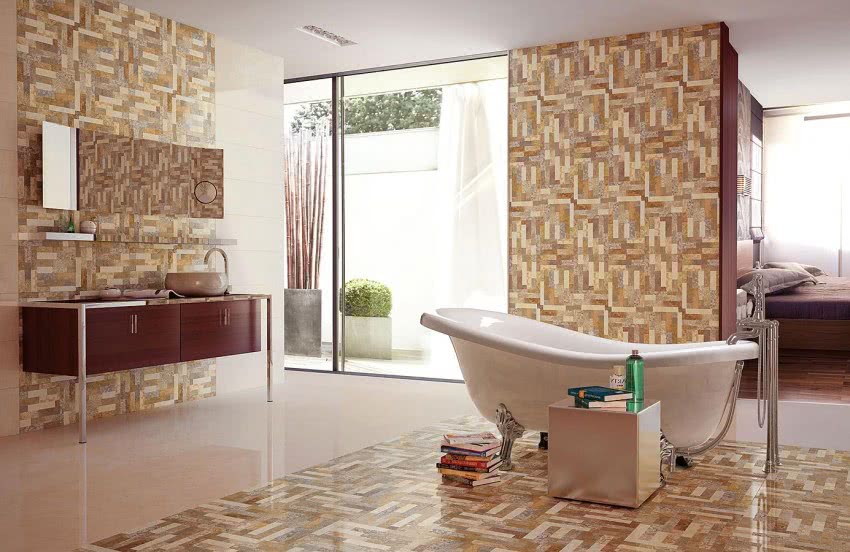 В современной ванной комнате этот эффект можно с успехом использовать на текстильных украшениях (шторы, подушки, коврики или покрывала), а также на стенах. Следуя этой тенденции, появляются готовые решения, в том числе: дизайнерские плитки.