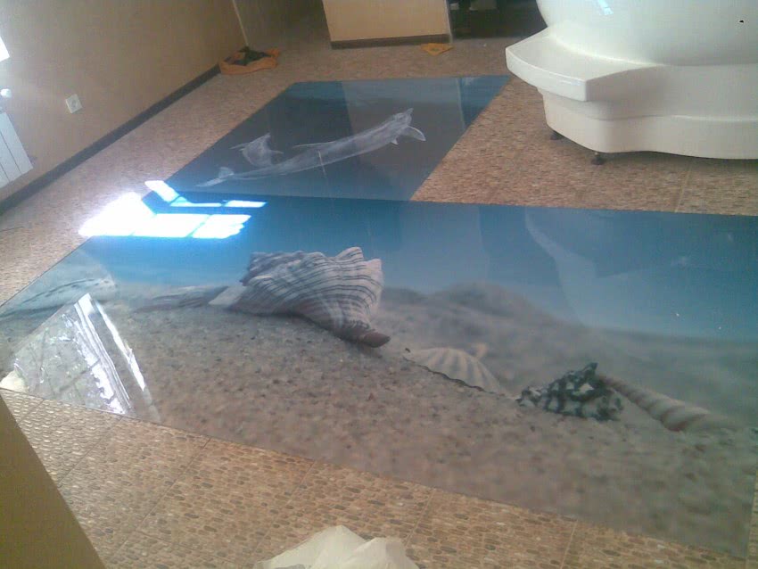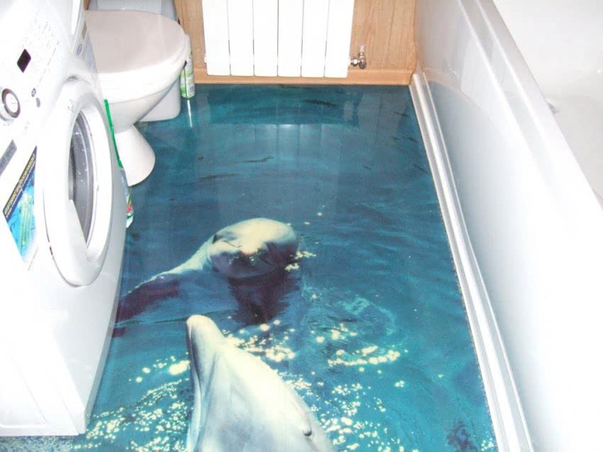 В современном интерьере ванны оригинально смотрятся наливные полы с 3-D эффектом. Специалисты не советуют делать подобное в очень маленьких помещениях, чтобы ощутить глубину изображения требуется некоторый простор.