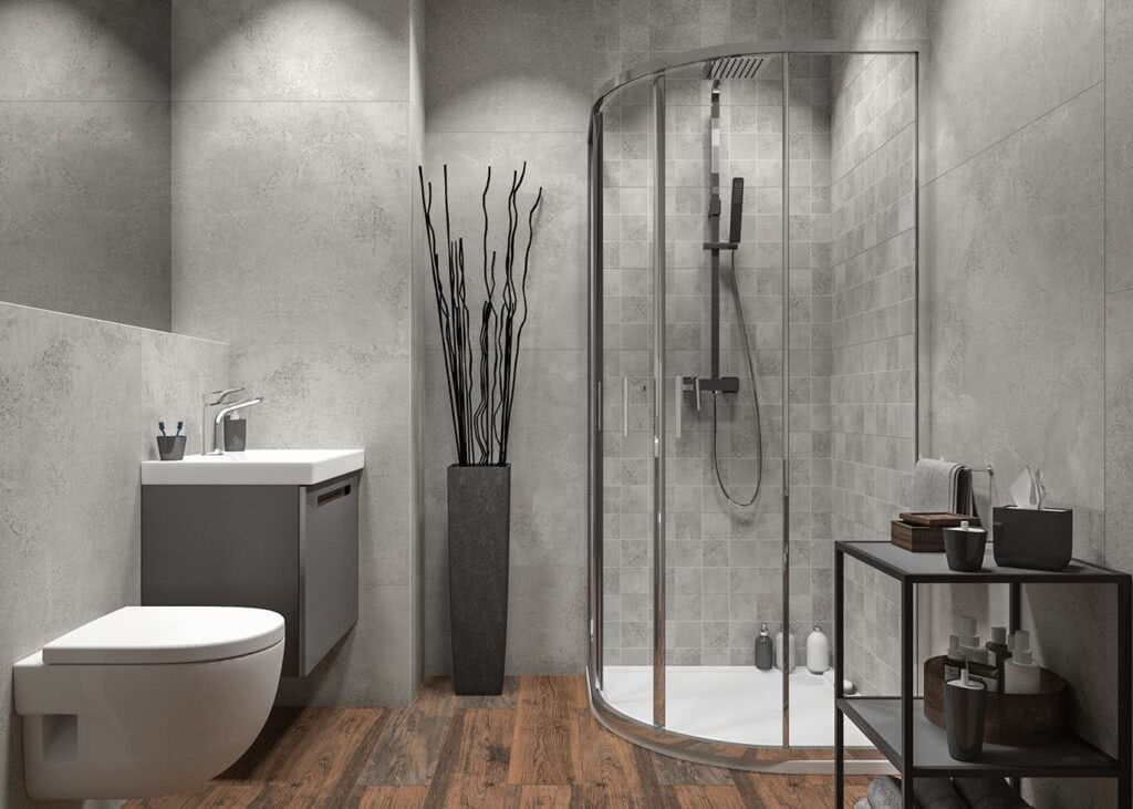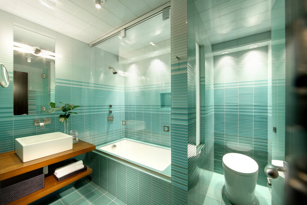 Функциональные зоны лучше ограничить другим расположением плитки, ненавязчивой сменой цвета или отдельным участком освещения. Стеклянная перегородка физически разделяет зоны, но остается невидимой. Она оптически увеличивает комнату, хорошо вписывается практически в любой стиль интерьера.