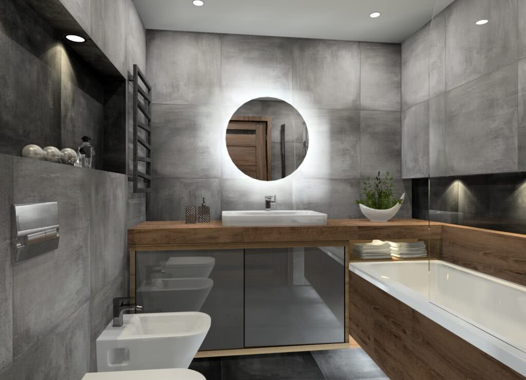 Также популярна идеально гладкая плитка, например, большая прямоугольная- белая или бежевого или серого оттенка. Чтобы нарушить монотонность готового интерьера, используются элементы контрастного цвета, например, светлая настенная плитка, более темная плитка для ванны и корпуса умывальника или внутренняя часть душевой кабины.