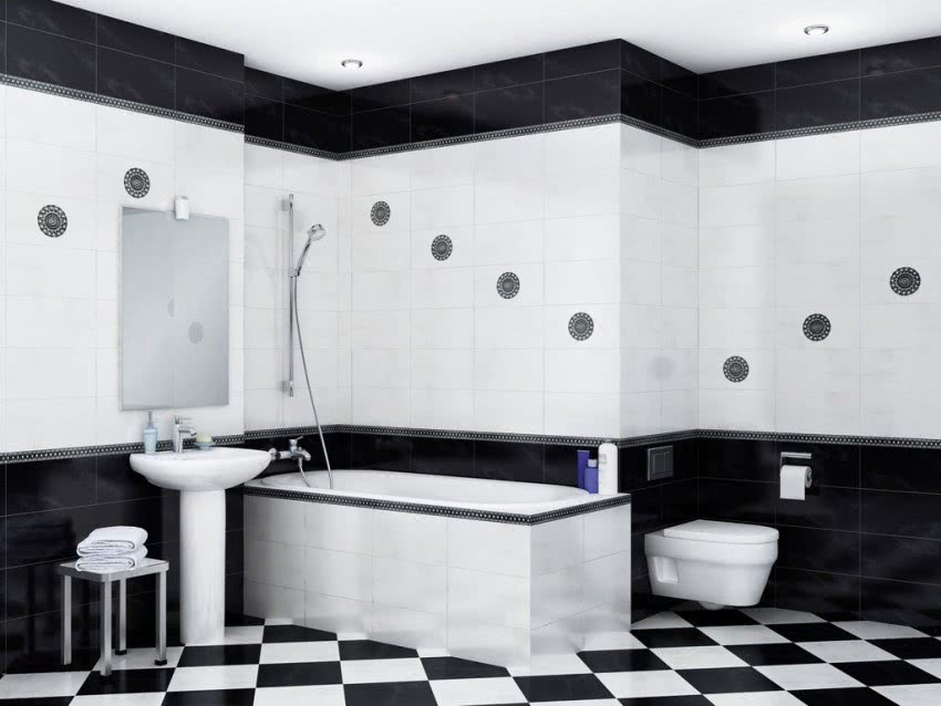 Монохромная черно-белая ванна стильно смотрится с полом, который представляет собой шахматную доску. Это традиционный дизайн популярен в любые времена.