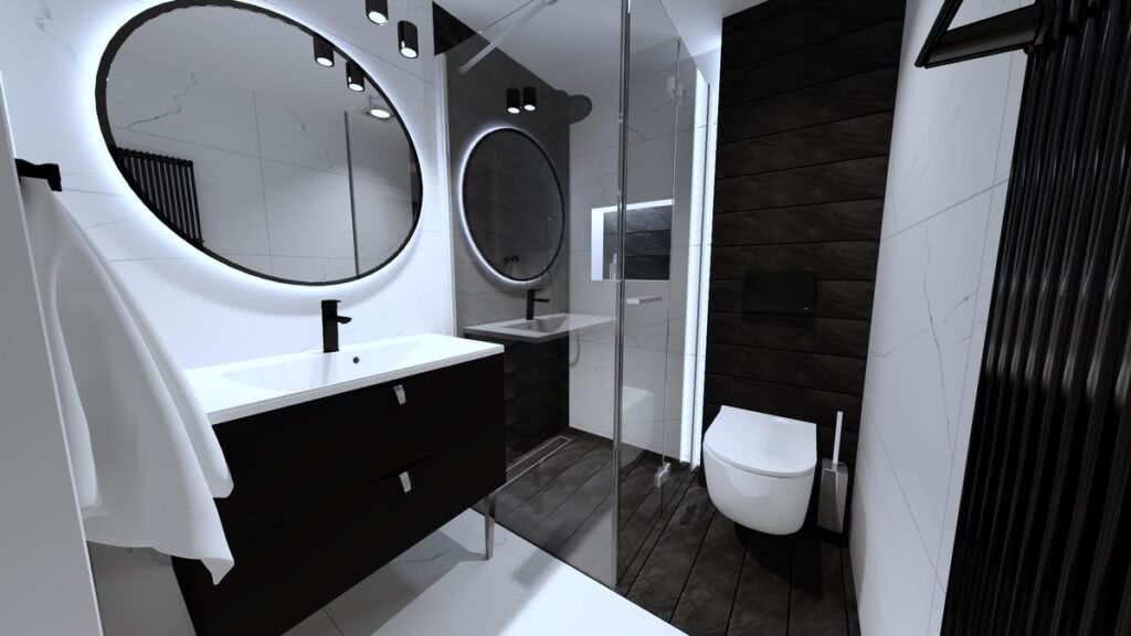 Черный цвет в ванных комнатах создает элегантную отделку, но дизайнеры все чаще предлагают сочетания черного и белого. Темный цвет, используемый в качестве доминирующего элемента, может, к сожалению, подавить оформление, что негативно скажется на восприятии пространства. Именно поэтому световые элементы часто становятся обязательной составляющей черного цвета. Удачным решением станет ванная, облицованная черной плиткой с керамикой в элегантном белом цвете. Такое сочетание цветов понравится любителям минимализма и современных решений. Плитка уже размером с каменную плиту и в то же время напоминает натуральный камень.