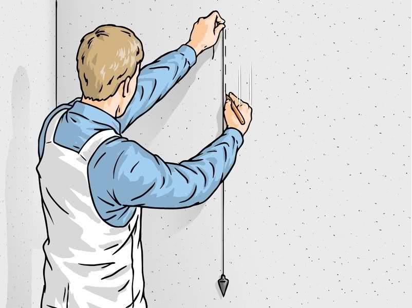 - Для переноса линий на стену можно использовать отвес, с помощью которого следует отметить четкую вертикальную линию. В подобных случаях наличие лазерного уровня способно значительно упростить работу, хотя с помощью отвеса можно добиться хорошей точности.