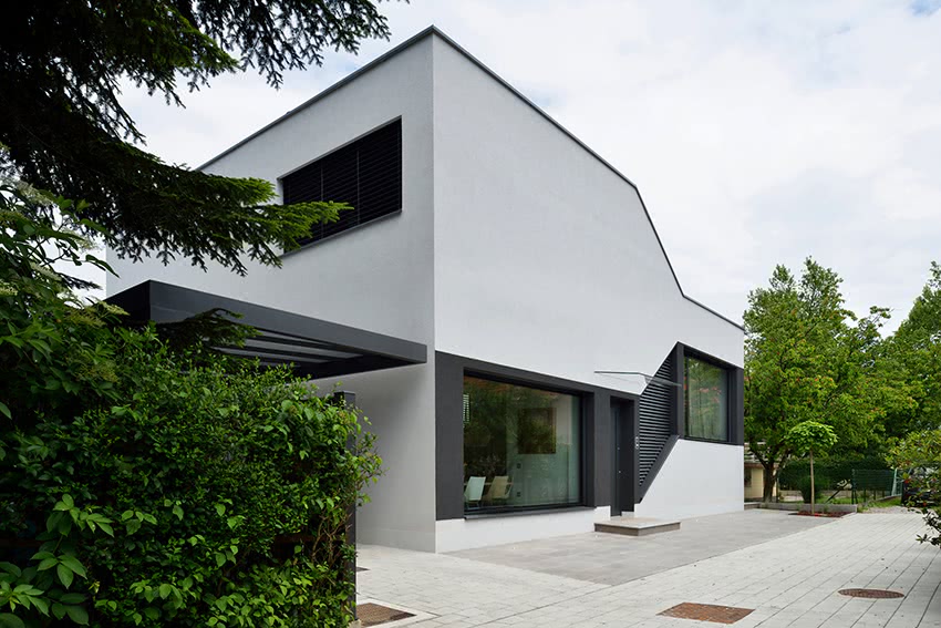 Если классический стиль вас не устраивает, и хочется чего-то очень современного и необычного, то этот проект должен вам понравиться. Дом рассчитан на проживание большой семьи или отдых приличной компании. Половину первого этажа занимает гараж на две машины, из него можно попасть в дом, пройдя через техническое помещение. Вторая половина первого этажа – огромная гостиная (45 м2) с камином и выходом на террасу. Гостиная совмещена со столовой зоной и кухней. Фишка проекта заключается в большой площади остекления гостиной и дополнительном выходе на террасу. Вторая дверь находится в непосредственной близости от кухни, чтобы обеспечить владельцам простоту в организации обедов на свежем воздухе. Также на первом этаже расположена кладовая для хранения кухонной утвари и запасов провианта, небольшая гардеробная зона, санузел и кабинет.