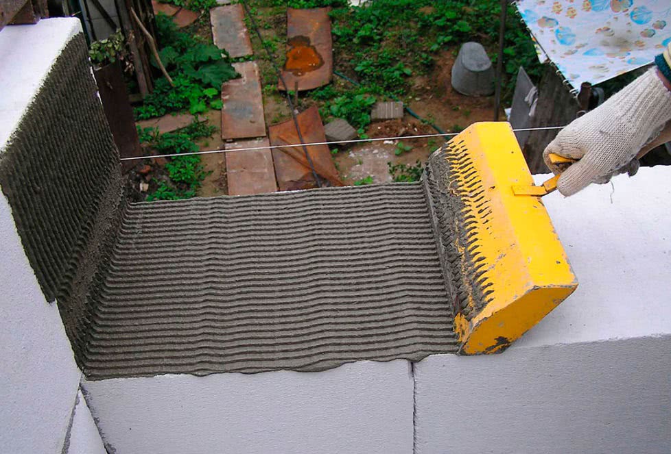 Чтобы выполнить кладку стен, используют раствор или специальный клей, который наносят специальным инструментом или гребенчатой лопаткой