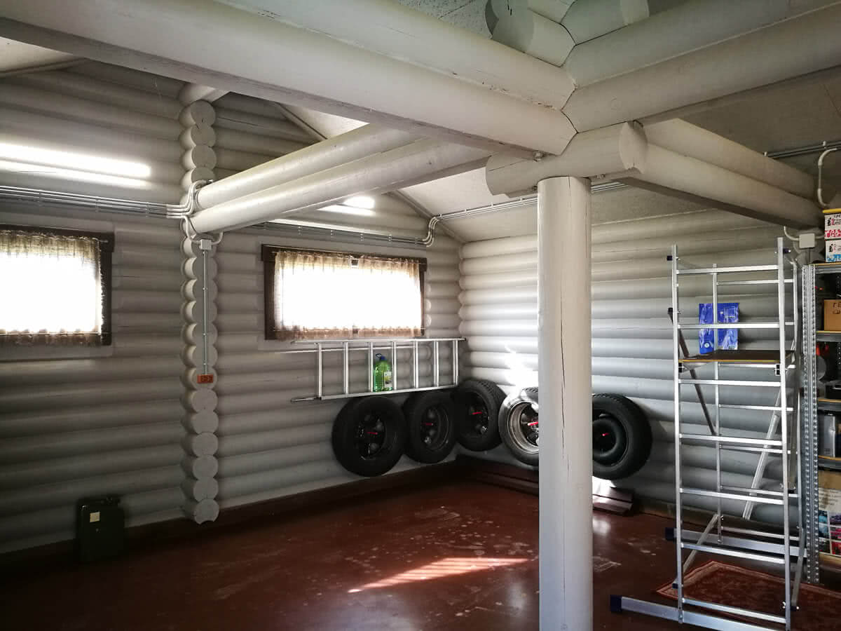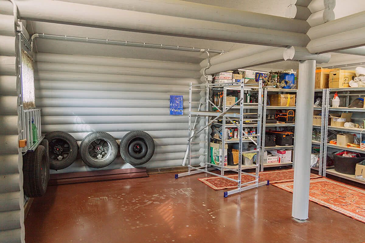 Помещение соседствует с гаражом. Объединили гараж с летней кухней для того, чтобы не возводить отдельную постройку: сэкономили на фундаменте, общей крыше и т.д. Внутри гаража все выкрашено в серую металлическую грунтовку, пол — наливной, износостойкий. В отличие от летней кухни гараж не отапливается. Но для машины это и хорошо: с холода машину в тепло, без мойки — это к ржавчине.