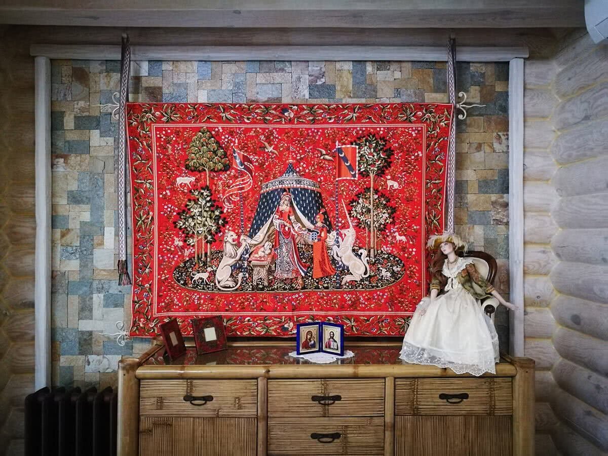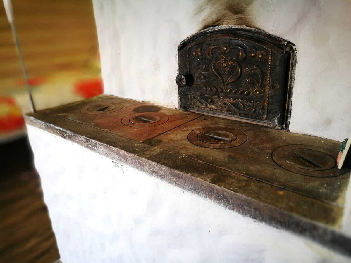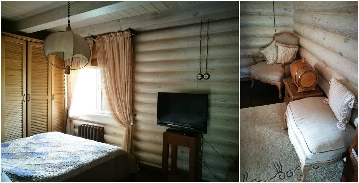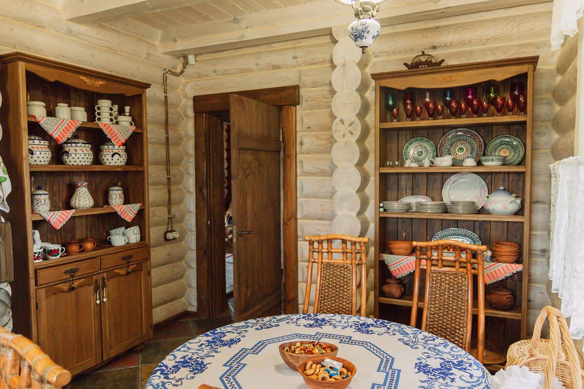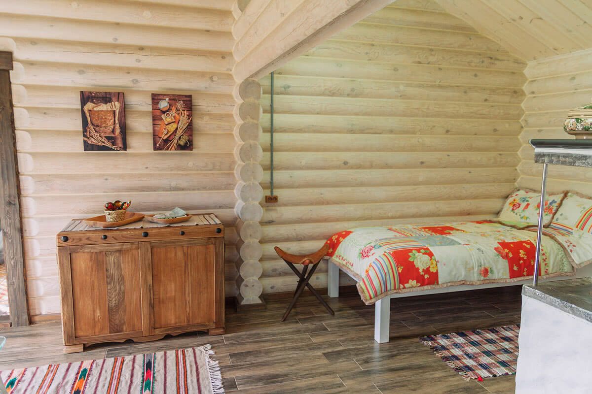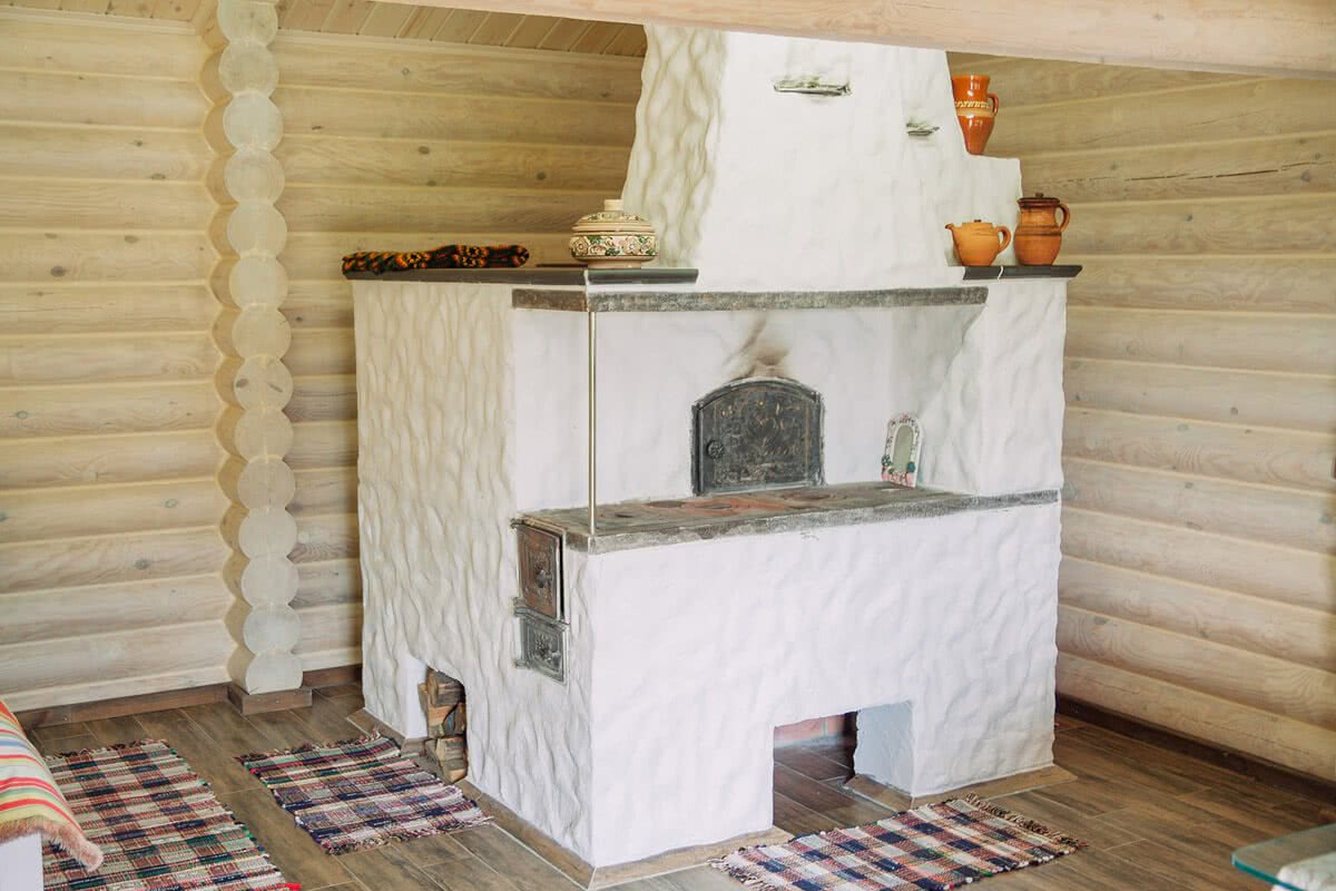 В гостевом здании стоит русская печь — не только для отопления, но и для повседневной готовки пищи. Мясо, утка, хлеб — в ней запекать можно все. Ее клали украинцы, даже глину специальную белую привезли с родины. Печь, конечно, все равно будет трескаться потихоньку — технология самая традиционная, все печи трескаются. Зато это помещение идеально для приема гостей: здесь можно ходить в обуви, большой стол, яства можно подавать прямо с печи… Ну, а если кто устанет — вон и кровать под боком.