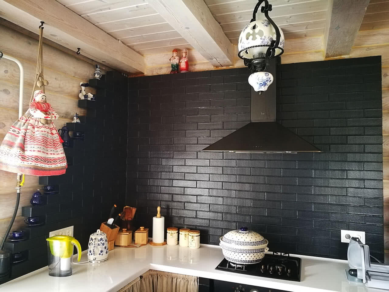 Практически вся мебель в доме — приставная, это было дизайнерское решение. Стены в доме первые два-три года двигаются, поэтому почти вся мебель стоит на полу. Исключение не сделали даже для кухни: навесных шкафчиков у нас нет, все хранится в напольных тумбах и двух шкафах. Стилизовали зону готовки стенкой из крашеного клинкерного кирпича, которая отстает от основной бревенчатой стены. Кроме декоративной, эта стенка несет еще и практическую функцию: продукты приготовления еды не попадают на древесину, не впитываются в нее.