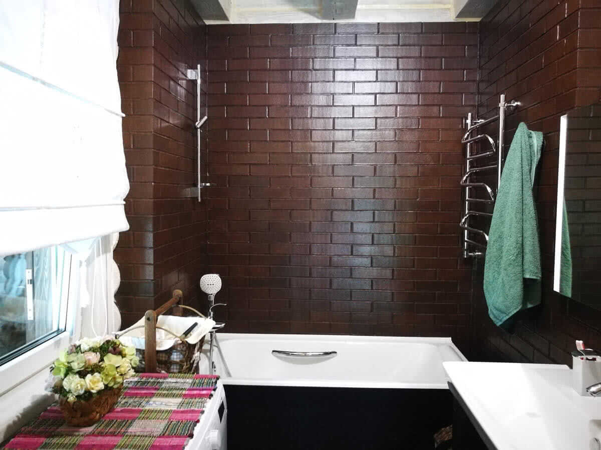 В ванной/туалете сделали аналогичное дизайнерско-техническое решение: «врезались» в сруб стенкой из клинкерного кирпича, к которой примыкает ванная. Стенку покрасили краской и покрыли водостойким лаком Remmers. И удобно, и практично — бревенчатая стена позади клинкерной «дышит», на нее не попадает влага.