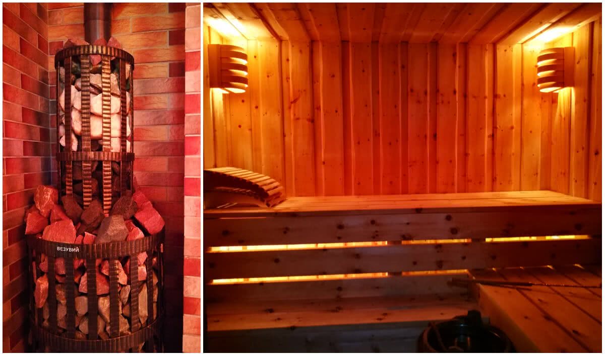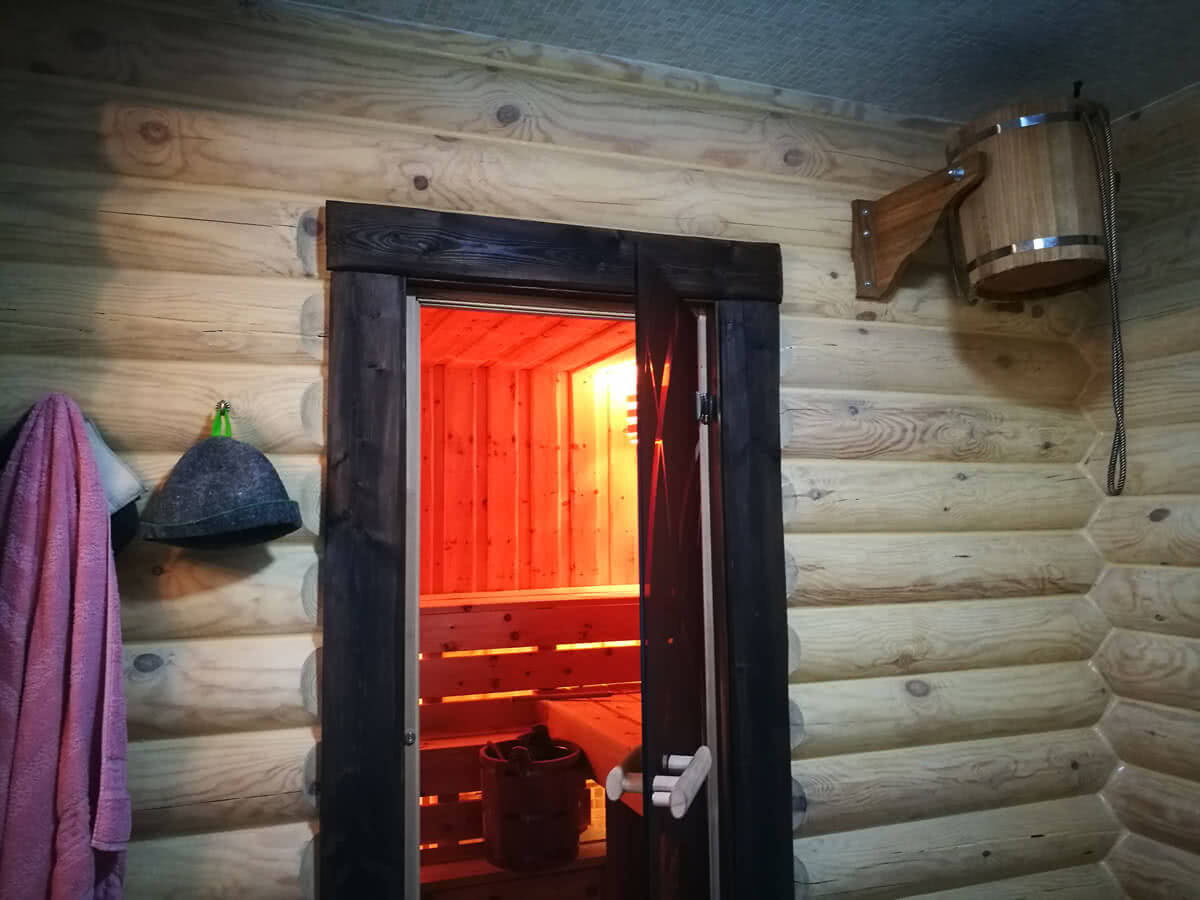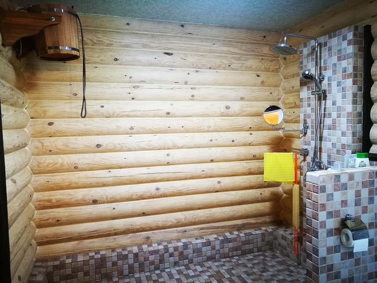 В бане установлена парилка с каменкой на дровах. Напротив выхода из парилки — помывочная зона, с отдельным водяным приводом в опрокидывающееся ведро, очень удобно обливаться после «пара».