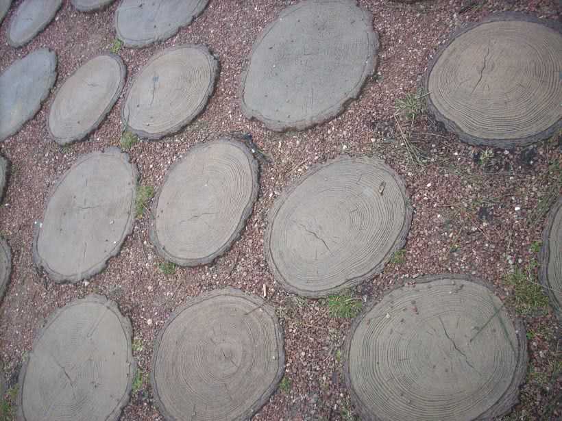 Укладывать рассматриваемый вид дорожки можно по-разному: чередуя большие и малые формы, выкладывая в виде различных орнаментов и узоров, фигур, создавая «островки» из деревянных элементов. Специфика создания данного варианта тропинки в том, что спилы необходимо частично вкапывать в землю.