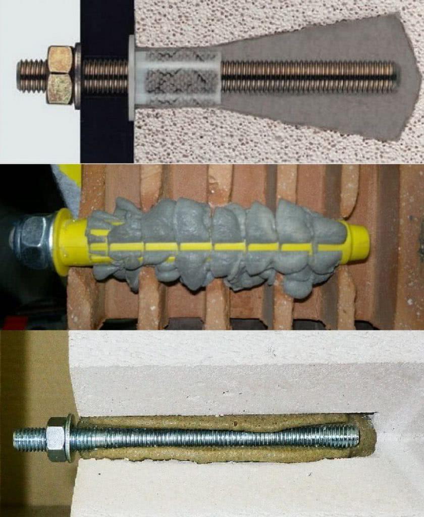 Химические дюбели монтируют так же, как и обычные, но с установкой клеевой капсулы. Затем монтируется метиз с резьбовым типом соединения.