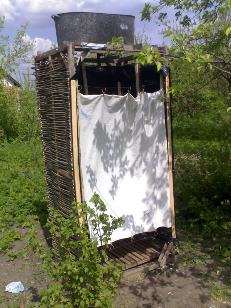 Еще одним интересным решением будет комбинирование. Например, три стены можно сделать из жесткого материала, зашив деревом или листом метала, или поликарбоната, а четвертая стенка может представлять собой ширму из непрозрачной пленки. К сожалению, на такую конструкцию погрузить бак для воды не получится, и поэтому воду можно пустить из домашнего водопровода.