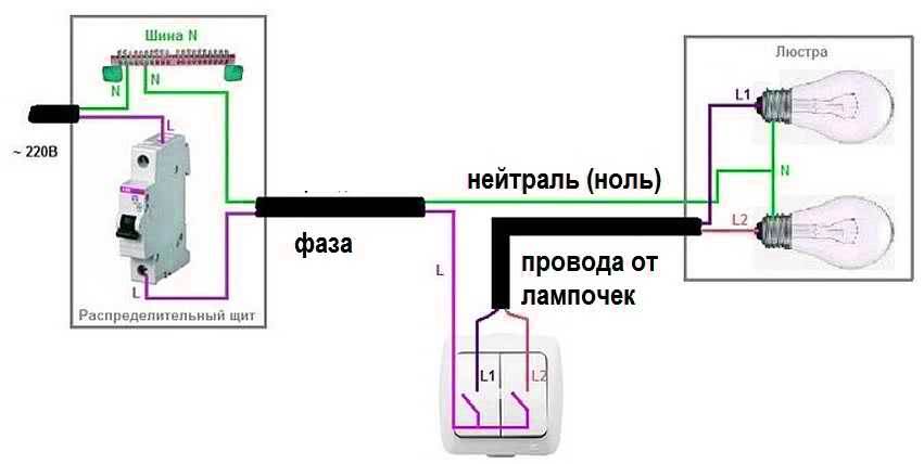 В принципе, подключение люстры через двухклавишный выключатель похоже на процесс ее подключения и через одноклавишный. Различие лишь в том, что фазные ламповые проводники делятся на 2 секции. И по одной скрутке от каждой ламповой группы подключаются (вместе) к ноль-проводнику. Оставшаяся пара скруток подсоединяется (по отдельности) к оставшейся паре проводов.