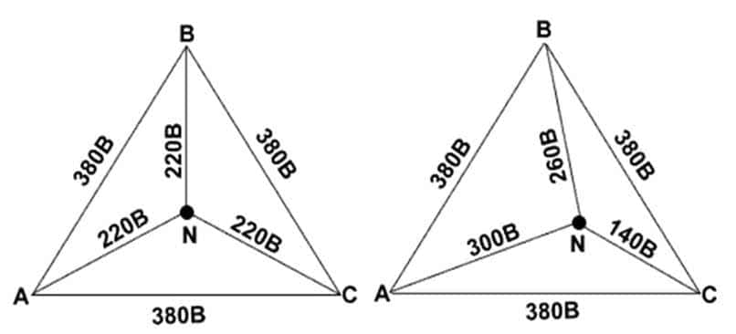При нарушении этого правила обеспечить полноценный нуль не получается, поскольку одна из фаз смещается в его сторону (можно сказать и наоборот). На приведенном ниже рисунке в векторном представлении показано, как происходит смещение нуля в сторону одной из трех фаз C (схема справа).