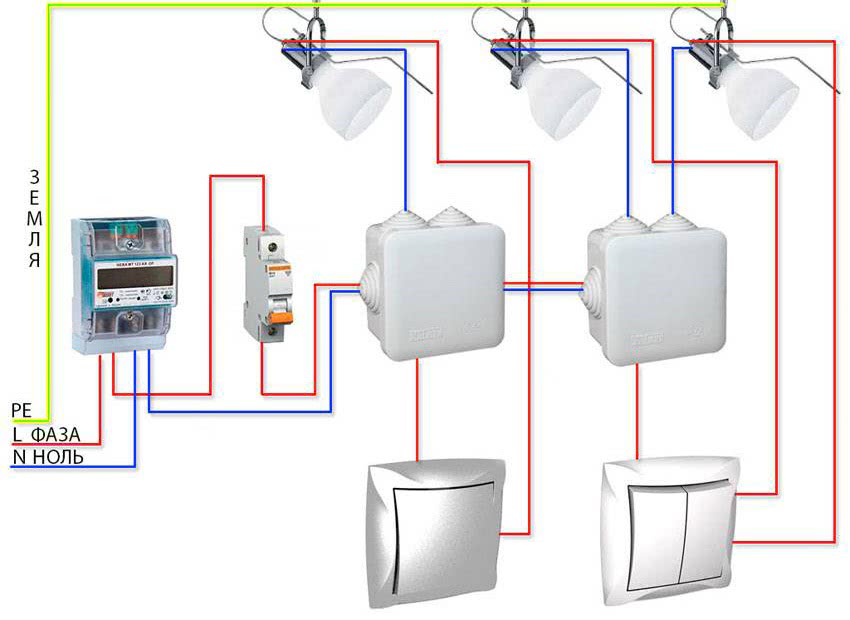 - К каждому осветительному прибору подводится трехжильный кабель: нулевой провод, заземление и фаза.