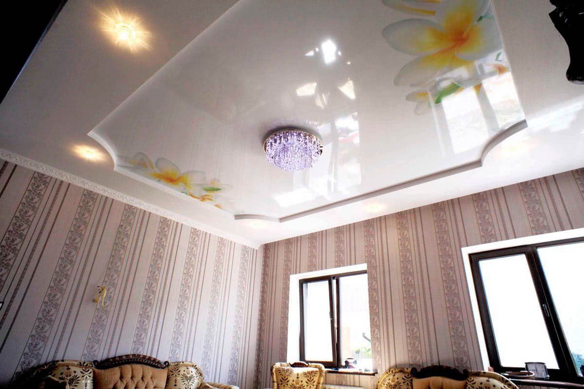 - Изделия с фотопечатью. Это оригинальное и стильное решение. На полотно можно нанести любое изображение, но большой популярностью пользуется небесный простор, изображение зеленой листвы, красивых цветов, мрамора и природных сюжетов. Некоторые пользователи украшают потолок своими семейными снимками. Фотопечать располагается не только на поверхности материала, но и проникает внутрь изделий. Это позволяет получить изображение высокого качества.