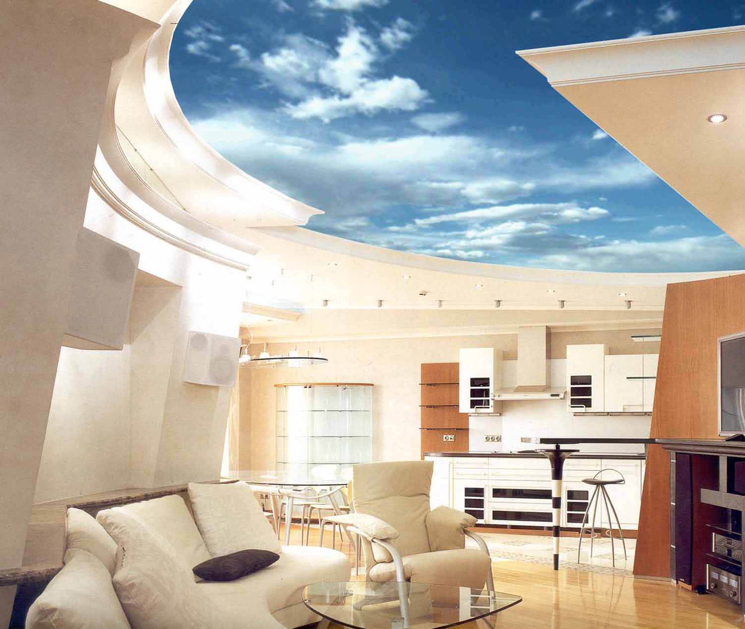 Оттенок натяжного потолка для гостиной желательно подбирать в тон общему оформлению. В просторных залах крупные конструкции и насыщенные цвета станут красивым акцентом, но в маленьких — лучше ограничиться изящной гипсокартонной рамкой по периметру, светлой глянцевой (сатиновой) пленкой или же рисунком ясного неба.