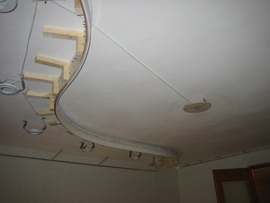 Многоуровневый каркас – применяется для монтажа нескольких ярусов потолочной отделки, создания сложных узоров и плавных обводов. Иногда создается многоуровневый каркас, где гипсокартон крепится лишь по периметру стен, а в центре – натяжное полотно из ПВХ или ткани.