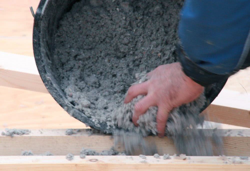 На горизонтальные поверхности предварительно распушенные в просторной емкости волокна просто высыпаются и разравниваются. Для разрыхления можно использовать строительный миксер на минимальных оборотах.