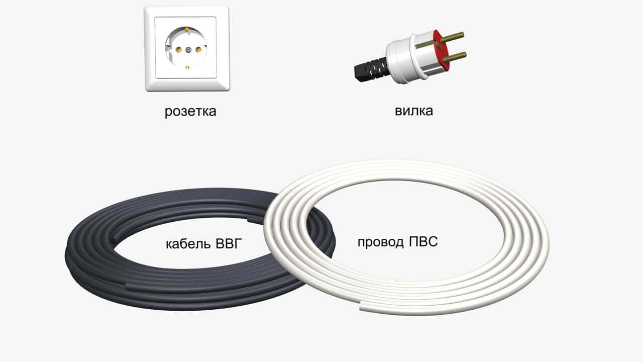• силовой кабель с 3-мя медными жилами сечением 2,5 мм² (например, кабель ВВГ 3х2,5 производства ООО «Кабель-Арсенал»). Изделие данного завода имеет следующую цветовую маркировку жил: белый, синий, желто-зеленый (ж/з); • розетка типа SCHUKO с контактом заземления; • трехжильный провод ПВС сечением 1,5 мм² и вилка (если в комплекте с кондиционером не поставляется соединительный провод). Для этих целей подойдет провод ООО «Кабель-арсенал» — ПВС 3х1,5-0,38 с такой цветовой маркировкой жил: коричневый, синий и желто-зеленый (ж/з); • автоматический выключатель (если предварительно не был установлен в квартирном щитке).