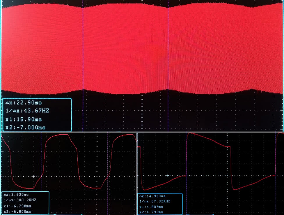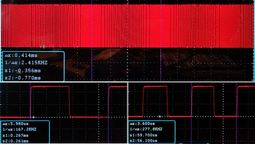 Здесь сигнал имеет циклический период ~23ms, частота меняется от ~67 до 380kHz.