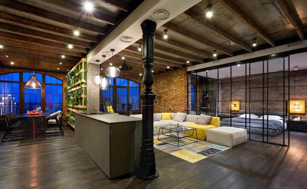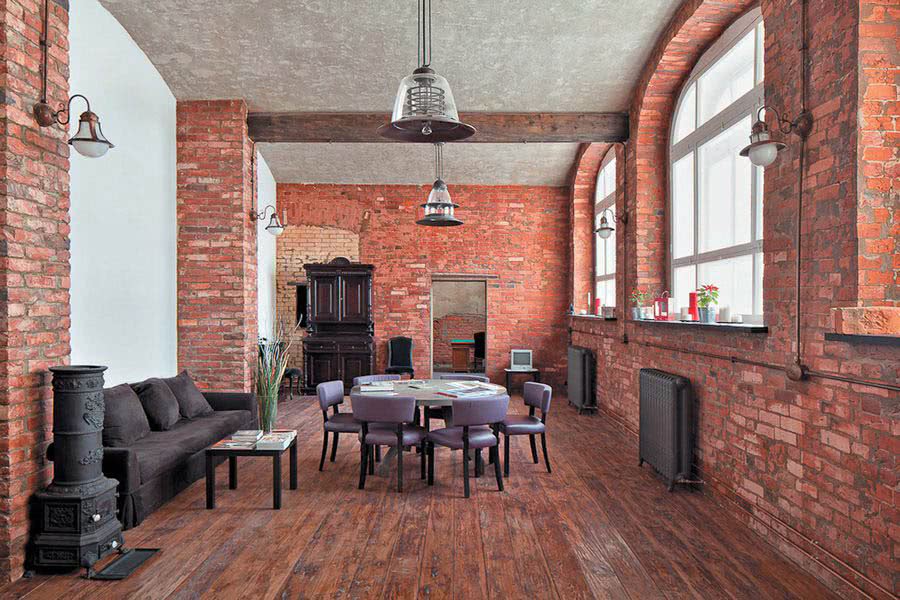 Еще один стиль, в котором можно использовать балочные конструкции и их имитацию, – лофт. В таких интерьерах нередко применяют отделку под необработанные поверхности из кирпича, бетона и древесины