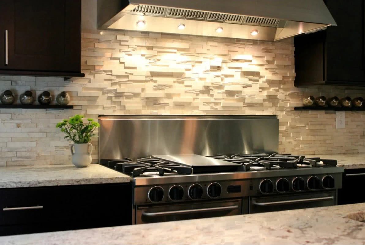 В группу надежных материалов смело можно добавлять и камень. Натуральный — весь, это практически вечная обшивка, которая выдержит кулинарные экзерсисы даже самых активных хозяек. Искусственный — только на бетонной основе. И желательно сразу покрыть его лаком, чтобы заметно облегчить очистку.
